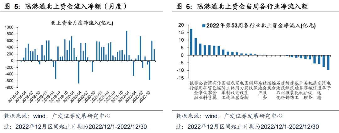 (5)陆港通北上资金流入净额:上周陆股通北上资金净流入29亿元,前一周流入44亿元。截至2022年12月30日,2022年12月北上资金净流入350亿元。上周净流入行业前五名是银行、非银金融、公用事业、食品饮料、商贸零售,净流出行业前五名是电子、汽车、交通运输、通信、机械设备。