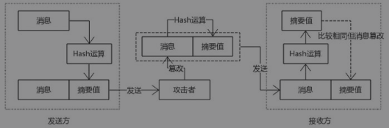攻击者对消息进行拦截,修改消息,然后计算该消息的摘要值(摘要算法是公开的),附在消息后面发送给接收方。接收方收到消息后,对消息计算摘要值,然后与接收到的摘要值进行比较,并没有发现有异常,而实际上接收到的消息已经被篡改。