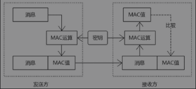 MAC值一般和原始消息一起传输,原始消息可以选择加密,也可以选择不加密,通信双方会以相同的方式生成MAC值,然后进行比较,如下图所示: