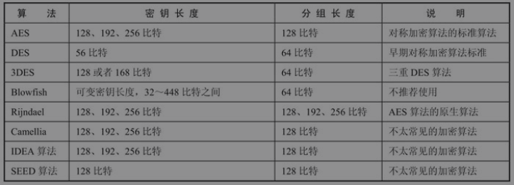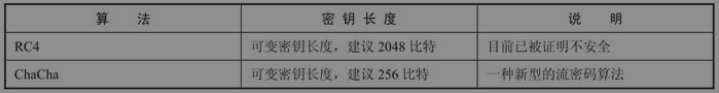 其次,对称加密算法有两种类型:块密码算法(block ciphers)和流密码算法(stream ciphers)。表 1 和表 2 列举了常用的块密码算法和流密码算法: