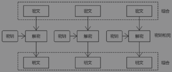 ECB模式(Electronic Codebook)是最简单的一种迭代模式,这种迭代模式是存在安全问题的,一般不建议使用。为什么不安全呢,我们看看其加密过程,如下图所示: