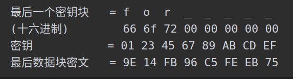 解密后,最后一个明文分组就是66 6f 72 00 00 00 00 00,去除明文末尾的 0 值,就得到原始明文。