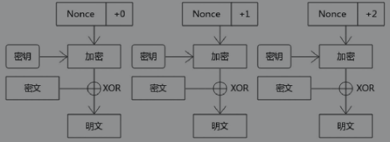 基本上,对一大块输入数据进行加密,过程是这样的:初始化加密算法状态(使用加密密钥+随机盐),对数据的第一部分进行加密,然后加密状态转换(使用加密密钥和其他参数),对下一部分进行加密,然后再次转换加密状态,对下一部分进行加密,依此类推,直到处理完所有输入数据为止。解密的工作方式非常相似。