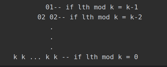 其中 k 为分组长度,lth 表示明文或者密文的长度。可以看出,如果数据块长度正好是分组长度的整数倍,也需要填充一个数据块。