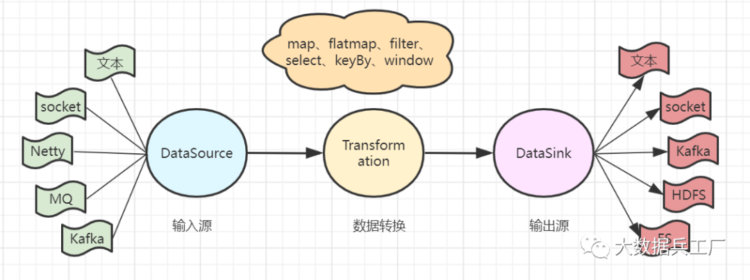 Flink DataStream API让用户灵活且高效编写Flink流式程序。主要分为DataSource模块、Transformation模块以及DataSink模块。