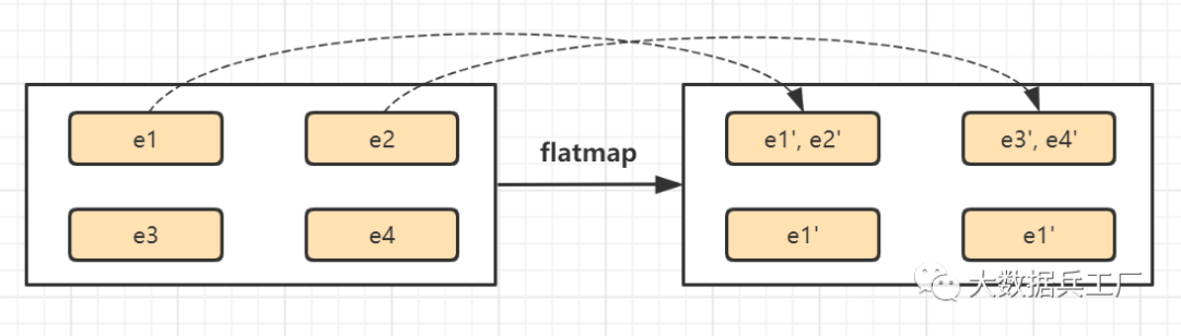 支持对数据集中所有元素转换成多个元素,生成新DataStream。