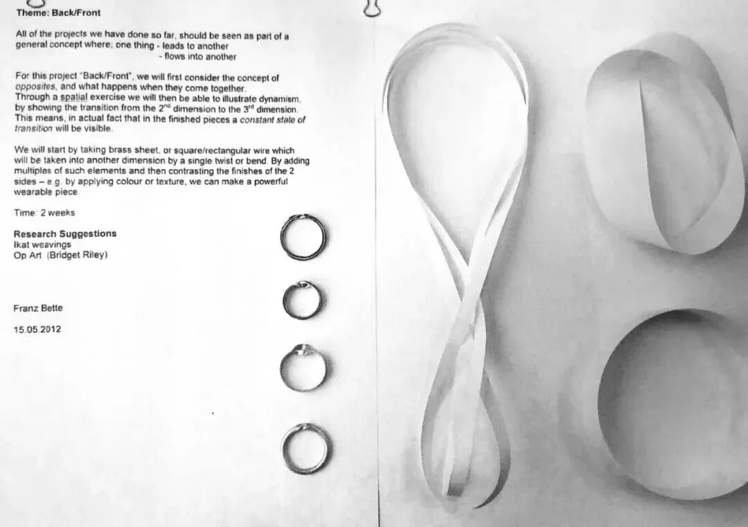 Jewellery has more than an ornamental character and purpose, it is composed of spatial, proportional, tactile and functional characteristics and is worn on the human body. The Mobius band explicitly shows the spatial transtion from 2nd to 3rd dimension.