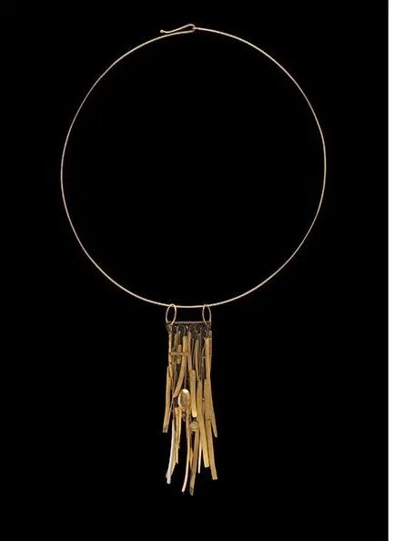 首先,我们采用黄铜片或方形、矩形的金属线做“一次扭曲或弯曲”,通过这一动作,即可将平面形态带入另一维度。通过附加多个此类元素,然后,將前后两个面做比对性精加工,比如:添加色彩或肌理,由此,我们即可创造出极富说服力的可穿戴作品。