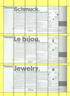 当我们“刻意”描绘出这些看似明显的流线、矩列和边距,便清晰的看见一个围绕多矩列(海报中有三大矩列)设计的理性网格。这些网格的生成,也反向定义了列阵中创建模块的流线的舒通动向。这样的网格模块设计,基于水平和垂直方向的排列。当然,从实验角度看, 这一模块也极可能被新开发的网格模块所替代,从而创建更富趣味性,但不失组织性的新构图方式。有了这一网格,对设计师来说,既可以选择利用它的优势,也可以选择自由破格。所以说,运用得当,便可在张弛间,做到收放自如。设计的第二阶段,将具有表现力的点、线、面(这里特指字符或句子、图列等)在限定版面内做有序组合,即塑造空间“力场”,同时,也定义着空间的“立场”。这一时候,立场与力场可谓平分秋色,至于均衡、统一、和谐、比对等传统形式法则,在力场的平衡取态中,彰显“立场”的存在。用魏因加特自己的话来说:“排版是设计思维、排版元素、印刷技术之间的三方角力”,其中技术赋予的可能性探索,几乎是永无止境的,而他本人即是一位身体力行,通过经年累月不间断的实验,让这一理念削骨传神,进入化境的艺术实践者。这样的一种探索精神与价值追求,荣我们大胆假设,或许也影响了当时整个莱茵河或黑森林地区,甚至整个德语区的青年设计师(包括当时的东德),其中自然也不乏首饰设计新锐(或金匠师们)。希望在不久的将来,我们可以从更多的文献及其蛛丝马迹中,印证今天的这一假说,待时日,再来呈报……