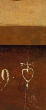 依旧是窗棂上的那条白色签名带,画家于潜心标注确切的年份、姓名之外,特别绘制了一个“心锁”标识。关于“心锁”,往往让人联想耶稣被钉在十字架上的那颗拳拳之心,但标识的立意似乎远不止如此。穿心而过的利剑或锁扣正暗示某种目标明确的“穿透性”。这一暗示,点晴般的提醒观者,需提升自身从表象察视至幻象察视的经验辨析。事实上,类似的“穿透性”,在画面中的其他细节亦有迹可寻,它们是:悬挂串珠的图钉、鸟喙和鲨鱼齿、火焰和闪电符、木桌上被刀割裂过的划痕、曾被利器穿孔的宝石,以及窗棂之外所有向内的目光投射。唯名论者认为,如果我们一旦相信个别的、可感的事物是为真实的存在,那么在个别物体中所拥有的共通特性,即表现为个别事物的相似性和共同性。因此世上并没有一个实存的共相,共相只存在于人的思维之中。所有可感的存在,都是思维的幻象。