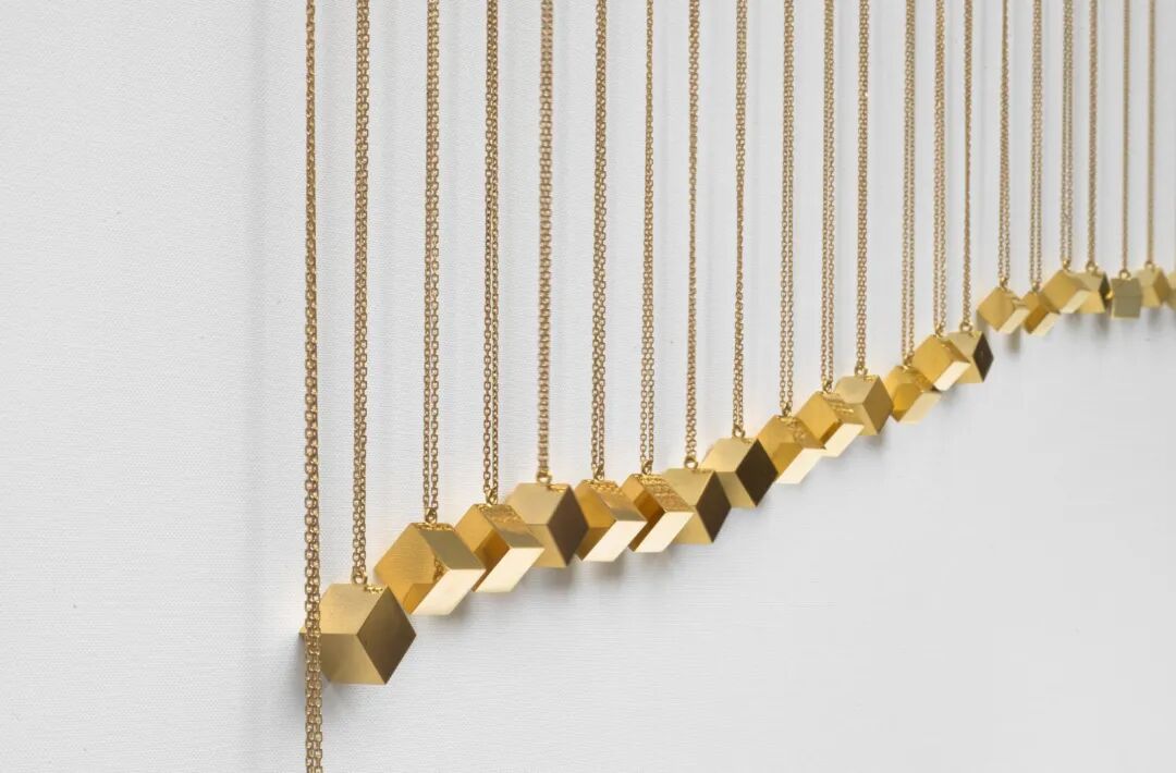 通过颠覆我们对物质属性的普遍理解,阿莉西亚作品同时也颠覆了目的论(Teleology),就像对黄金而非煤的偏爱,对宝石而非路边石的偏爱一样,显然目的论最终决定的是一种既定的世界观。如果说,赋予某些材质的优先等级制度在阿莉西亚看来是不合逻辑甚至荒谬、混乱的,其作品则试图通过激发我们自己对其真实性的质疑来反思这一混乱。阿莉西亚探讨了现实结构的起源和应用,这些结构基于社会习俗——文化模式、默契和代码——在雕塑、装置和图像等灵活取用的诸多表现手段中,将人的审美诉求与挑战看待事物的习惯方式合二为一。另一个项目 “GoldVolks” 也和黄金有关。该项目最终作品是由艺术家与柏林一间金匠工作室品牌:Georg Hornemann(格奥尔格·霍尼曼)合作完成。GoldVolks 本意是指多数国家的中央银行持有的国家黄金储备量,简单来说,就是观念或理论意义上每个国家在譬如金融、生态危机、战争、饥荒时期为其公民提供安全保障的黄金储备。据有史记载至1973年,黄金一直都是货币的后盾——一种被称为“金本位(Gold Standard)”价值认知体系设定。如今,这一观念稍有变动,维持定量黄金储备是既为了对冲美元汇率波动的风险,同时也为危机时期做金融准备。由于黄金,在广义的全球范围内被普遍接纳为一种支付手段,大量的黄金储备也因此明确地表征为一个国家的高度自主。目前,从总部设在瑞士的世界黄金协会(World Gold Council)获得的数据显示,97个国家与地区已正式公开他们业已量化的黄金储备(GoldVolks)。以2015年为例:美国以8133.5吨的储备量位居榜首;德国以3384.2吨的储备量位居第二;黎巴嫩以286.8吨的储备量排第19位(中国在2015年报告为1762.3吨,2020年为1948.3吨)。根据这一数值,阿莉西亚将这97个国家的黄金储备资产按每个国家的官方人口(数据来源于:CIA世界各国纪实年鉴,又称:CIA世界概况 / CIA`s World Factbook )(注:“CIA世界概况”是由美国中央情报局出版的调查报告,发布世界各国及地区的概况,例如人口、地理、政治及经济等各方面的统计数据。任何人都可以无需中情局批准而自由引用或转载,只需注明资料来源即可——节选自百度百科。) 数量进行划分,并由此获得人均数值,再邀请上方提及的金匠工作室——Georg Hornemann将这些按人均计算的数值,用24k足金铸造了相应体量,清晰简明的几何体与链,最终获得97件金立方坠链。根据人均数值,每条坠链显示出体积、大小、体量的不同,但每一件都因配有精致细链的助力,故而无妨佩戴,且人人皆可。此作品中,每一位公民对黄金的所有权,在佩戴者感知和观念的意象交叠中变得清晰。换言之,当金立方坠链被佩戴,意味着一种假设——假设这位佩戴者(或公民)当下正“拥有”一份黄金。佩戴者通过将24k足金切身佩戴,以获取对黄金物的体感与量感的直接体验,一份由国家的黄金储备为民众所储备的金量的多少,即每一位公民理当在危机时刻被分配的金量的实质,通过佩戴,了然于心。 作品:GoldVolks / 国家黄金储备值