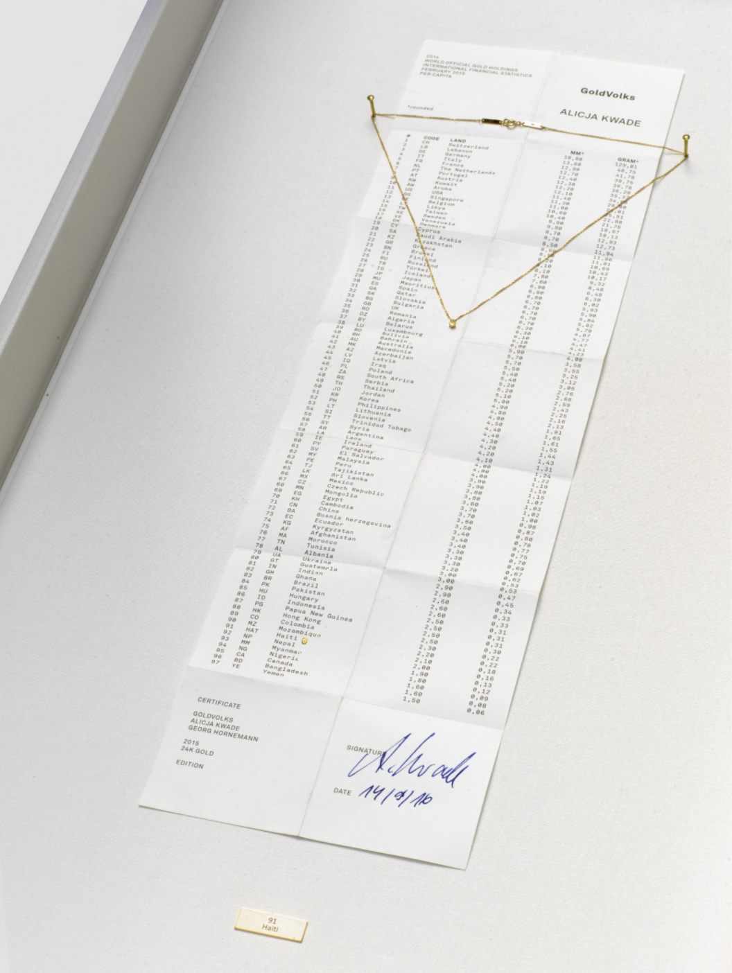 最终,97条金立方坠链,一个挨一个地置悬于一块素简的塑胶亚克力盒里,以曲线图的方式呈现了全球财富分配的衡量标准,人们因此在视觉和触觉的双重感知上,领略到原本抽象的数字列。这一可视化的波状图表从瑞士(129克)开始,至也门(0.06克)结束。对比之前的储备量,我们发现了一个全新的结果:在人均储备排名中,瑞士依据最高排第一;德国排第三;美国的情况很糟,下滑到第十三位;但另一方面,黎巴嫩的金立方反而非常大,仅次于瑞士,排第二。在作品首次推出的柏林当代艺术博览会期间,阿莉西亚邀请参观者戴上其中某一条坠链,也许是该佩戴者自己国家或地区的坠链,也许是他国或他地区的。那些无人问津,或无人愿意代表的国家或地区链便永久的停驻在亚克力盒内。佩戴金立方的参观者,在那一刻,或许会产生一种跳脱常规经验、暂时分享了该国家或地区财富的幻知,即便这个国家或地区的繁荣未必是所有公民皆可享有。今天,黄金的抽象价值仍然被视为危机时期的最佳保障。尽管黄金价格是由一小群“金融精英”——伦敦黄金市场协会(London Bullion Market Association,又译:伦敦金银市场协会)的成员确定,但全球政治、经济和对这一价值的狂热信仰,几个世纪以来几乎不可动摇。因此,佩戴金立方坠链不仅是一种象征性的姿态,宣称佩戴者理论上占有国家储备金的份额,同时也标志着佩戴者对这种贵金属的信仰,即“金立方”已化身为信仰的象征,个体正通过媒介,参与到地缘政治的问题中来。可吊诡的是:人均黄金持有量的分解,虽是一种将相对假想财富形象化的智慧方式,但作为观众的我们,若进一步深思,也极可能产生疑虑,金立方链的存在,是否真正灌输了一种参与国家财富的意识?同时也疑虑,它的存在,是否真的能够在实际意义中起到了平等分配以获取相应的象征作用?阿莉西亚并没有忽视这一点,在后来的一系列访谈中,她再度指明,在柏林国际艺术博览会上的行为演示(也是在艺博会语境中的首次行为表演),内含某种测试意义。戴上金立方链的多数人,的确没有产生对作品所内涵的不平等意识的关注(当然,这里也涉及到另一问题,即通常一个城市中都是有着怎样社会背景的人在消费艺博会)。事实上,这件作品,既没有真正提供把它转译回世界史的方法,也没有将受众或穿戴者从他们的价值认知的舒适区中震荡而出。这些金立方的存在,凸显了国别间的差异,一种人为创造的——“与同胞分享财富的知觉”——的确如上述——不过是场幻觉。这一幻觉背后的作用力,反倒是一种坚定的信念,即对黄金是作为昂贵贵金属的深信不移。