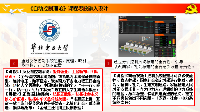 ● ● 通过讲解线性系统设计与校正方法,不同系统、不同发展阶段对系统的要求不同。引导学生用发展的眼光看问题,终身学习,与时俱进,始终拥有先进的理念和较高的职业素养。通过课后调研正确理解生态文明建设写入党章的新时代背景及意义,作为电力人该有怎样的理念又该如何担起责任?