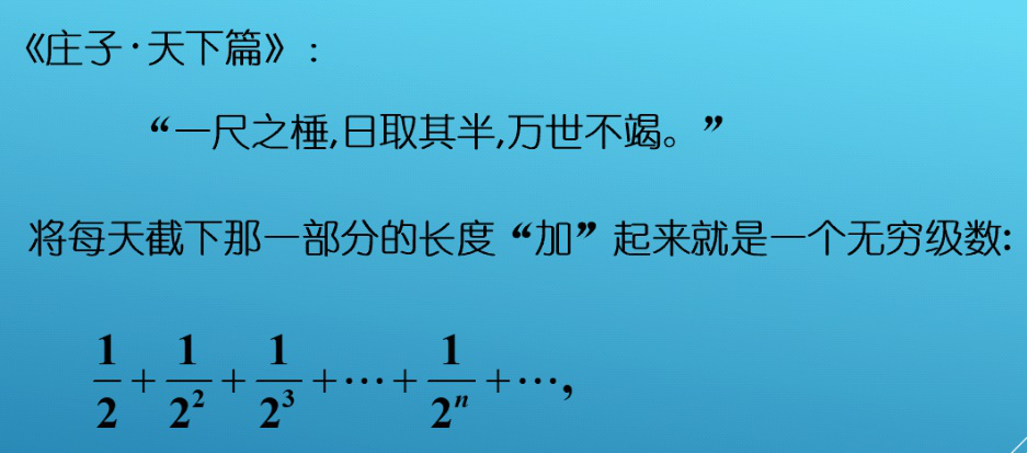 1. 首先,从公元前300年我国著名哲学家庄周所著的《庄子·天下篇》里关于无穷级数的数学思想讲起,自然的引出无穷级数及其收敛的概念。