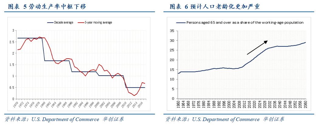 其次,老龄化仍将持续。美国人口老龄化通过它对储蓄的影响拉低了利率水平,美国的总储蓄率在1980年开始快速上升,背后是65岁人口占比不断上升。根据美国经济署的预测,美国人口老龄化现象在未来十年内会继续加重。