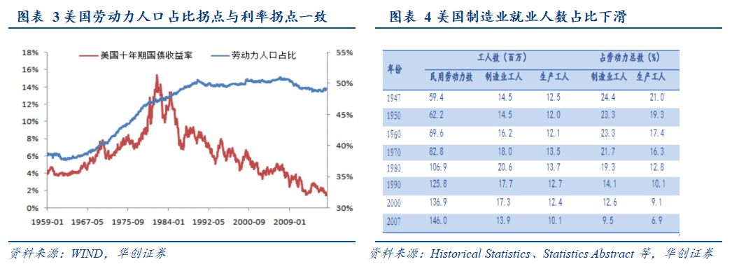 另外,重资本的工业经济占比下滑降低对资本的需求,资本投资增速是历次经济复苏中最弱的。1980年后美国金融创新带来金融引擎,经济增长主要靠赤字、信贷,工业性投资降低,同时服务业占比提升,可以从工业工人占比总劳动力总数在从1980年开始陡降看出,最终反应在GDP上,看到GDP经济增速中枢下移,重资本依赖的工业占比降低,服务业资本依赖较低,整体对冲后造成对资本的需求下降。
