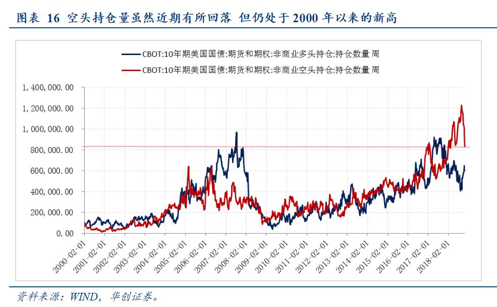 交易层面,目前美国空头持仓量已经达到2000年以来高点(虽然近期有所回调),意味着后续再继续加仓的空间有限。警惕一旦有美国经济信号低于市场预期,空头集中平仓或触发踩踏从而使得利率快速下降。
