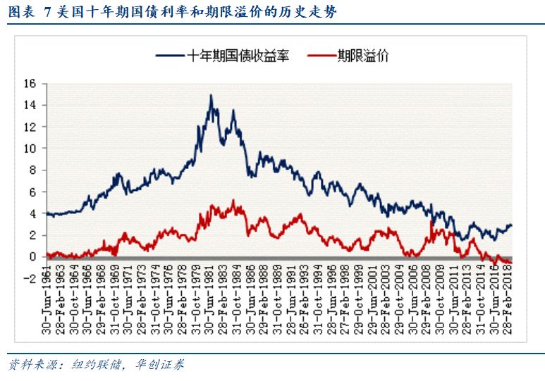 根据伯南克的解释,期限溢价是持有长期限债券的债权人所要求的额外回报,用以弥补他潜在的投入短期限资产的机会成本。一般而言,长期收益率高于短期收益率,以显示积极的期限溢价(相较于短期限证券,投资者对持有长期限债券要求额外的期限补偿)。期限溢价无法被直接观察,需要通过短期及长期利率的数据估计而得。纽约联储的AMC模型估算了1961年以来10年期国债收益率期限溢价水平。从次贷危机之后,受主要央行量化宽松货币政策刺激,期限溢价基本延续了下行的趋势直至2014年期限溢价达到负值。目前来看,虽然现在量化宽松有所退出,但是或将被债券的刚性配置需求对冲。