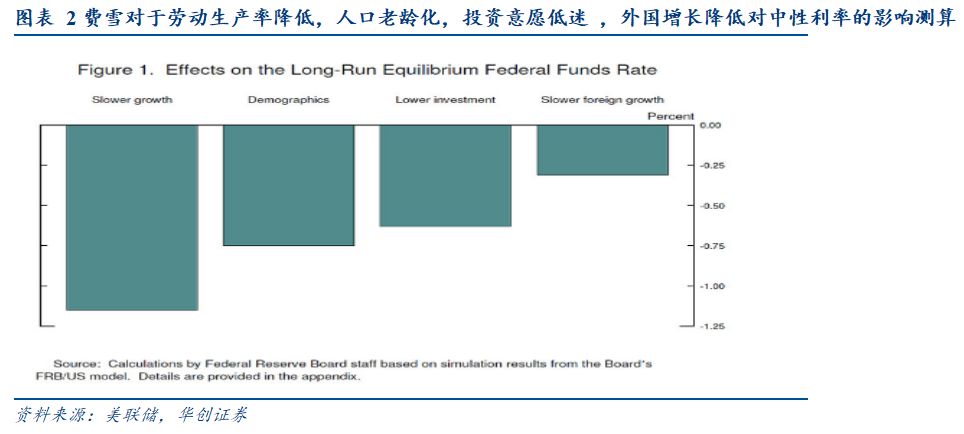 根据美联储官员、经济学家费雪(2016)的研究,劳动生产率下降、老龄化带来的储蓄过剩、投资不足以及全球增长趋势是1980年以来美国中性利率下行的主要原因。下图显示了费雪对于四个因素对中性利率的影响测算。四个柱状图从左往右分别为:劳动生产率降低,人口老龄化,投资意愿低迷,外国增长降低。根据美联储的FRB/US Model测算,这四个因素分别使长期利率下行了120个基点、75个基点、60个基点和30个基点。