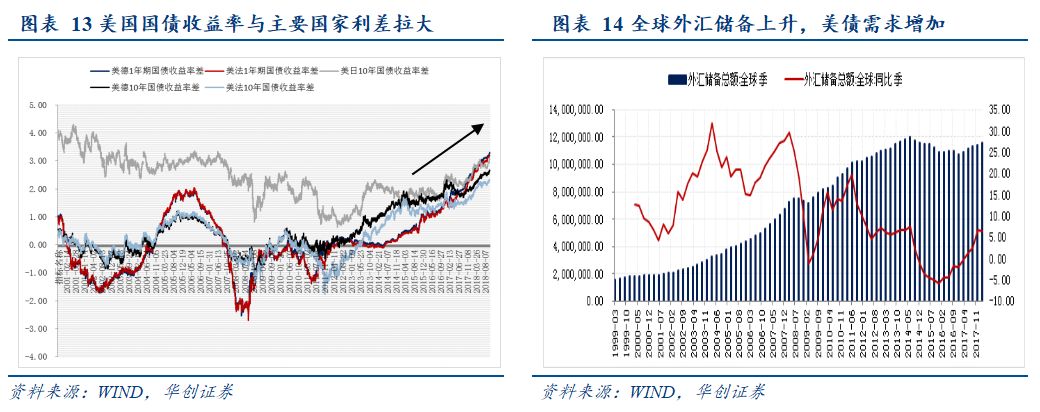 需求端—美债配置、避险价值仍然突出,需求旺盛:首先,美联储缩表对国债需求影响不大,存在提前结束的可能性。美联储最终合意的资产规模在2-2.6万亿美元之间(对应年4000-5000亿左右的缩减额),整体缩减量占美国债券市场存量占比为1.7%,实质资产端冲击有限。另外,如果明年美国经济或资本市场有较大下行压力,不排除美联储调整货币政策,提前终止缩表的可能性。其次,全球外汇储备上升,美债配置需求增加。全球外汇储备从2017年4季度的11.43万亿美元上涨了6.39%至2018年1Q的11.59万亿美元。美国国债是各国央行投资的主要品种之一,外国持有的美国债券总额随着外汇储备的上升也逐步上升,外国持有的债券总额从2017年末的6.209万亿美元上涨至2018年1Q的6.211万亿美元。另外,美国国债收益率相较其他主要国家仍处高位,投资价值明显。美国国债收益率虽低于中国国债,但长期高于德国、日本、英国、法国,并且利差在逐渐拉大。最后,2018年地缘政治风险加剧,资产波动率上升,美债作为避险资产需求凸显。