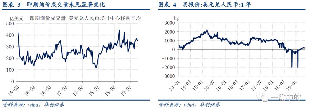 我们目前认为CNH-CNY差值衡量贬值预期的方法已经失效,离岸人民币池子规模目前仅有2015年汇改前一半左右。且央票频发的背景下,CNH无论是背后的交易承载量还是指示灯作用都已经明显失效,基本可以在整体贬值预期的严谨分析框架中淡化该指标。可以从图中清晰的看到,汇改前,CNH波动率明显大于CNY,但是从2016年年底至今,二者已经基本是同步波动。