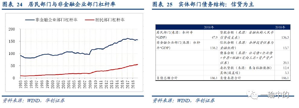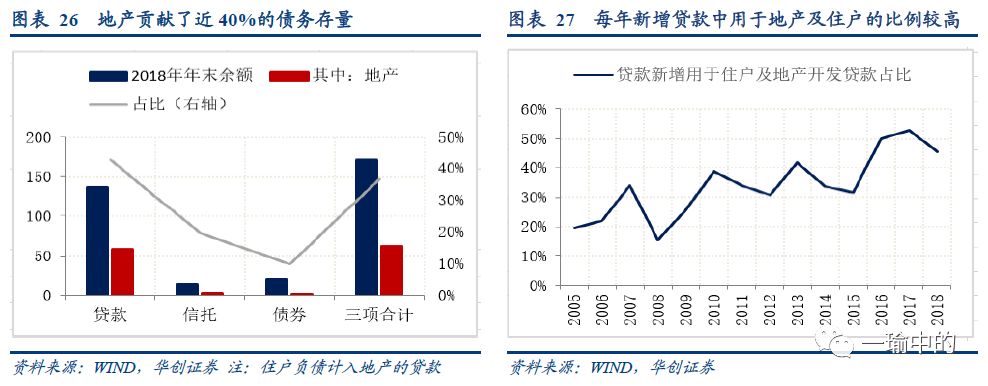 实体部门当前债务存量是多少?对于实体部门(注:住户部门+非金融企业部门,不考虑政府部门)而言,获得融资的途径主要有信贷、债券、信托贷款、委托贷款以及股权融资,其中前四类基本组成实体部门的债务总和。以2018年年末为例,实体部门宏观杠杆率合计为206%(住户部门53.2%+非金融企业部门153.55%),据此测算,实体部门债务存量是186万亿。结构拆分来看,贷款余额为136.3万亿,是实体部门加杠杆的主要源泉。其他有信托余额(去掉投向金融及证券部分)13.7万亿、信用债(去掉金融债,仅计算公司债、企业债、中票、短融、定向工具及资产资产证券这六类)20.5万亿、委托贷款12.4万亿(取自社融)。地产占据了多少债务?从存量角度看,截止至2018年年底,43%的贷款用于住户部门及地产开发,20%的信托资金投向房地产,10%的信用债来自房地产,三项合计来看,地产占据了37%的存量债务。从增量角度看,以贷款为例,每年新增贷款中,用于住户及地产开发的比例逐年提高,2005年仅20%,到2016年以后,每年有50%左右的新增贷款用于住户及地产开发。![]()
