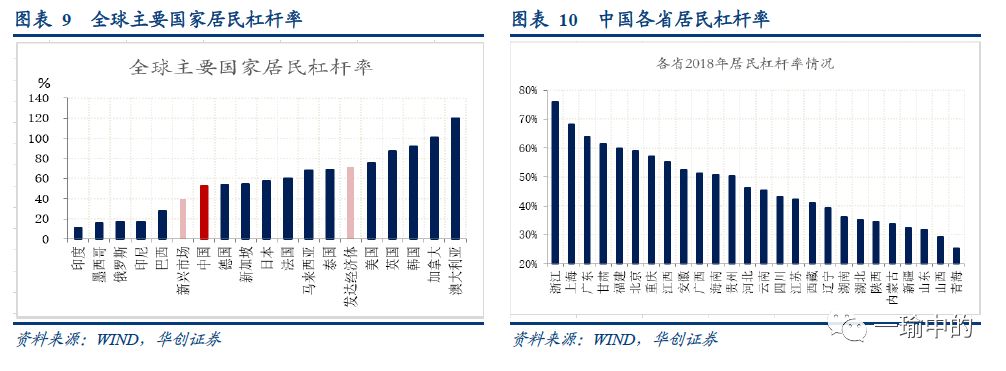 地产快速增长的背后是居民杠杆率的快速提升。对于居民杠杆率,国际经验来看,居民杠杆率越高,金融风险越大。美国2008年金融危机发生时,居民杠杆率高达96%,此后再没有超过这一水平。日本1990年发生金融危机时,居民杠杆率达到70%,此后基本也开始缓慢下行。怎么看中国的居民杠杆率?静态看不算高,但也不算低。截止2018年,中国的居民部门杠杆率为53.2%。与其他国家相比,中国比新兴市场国家整体要高一些,比发达国家整体要低一些。但已经较为接近德国、日本、新加坡、法国等发达国家的水平。分省市来看,浙江、上海、广东最高,均超过了60%。其中浙江高达76%,超过美国。![]()