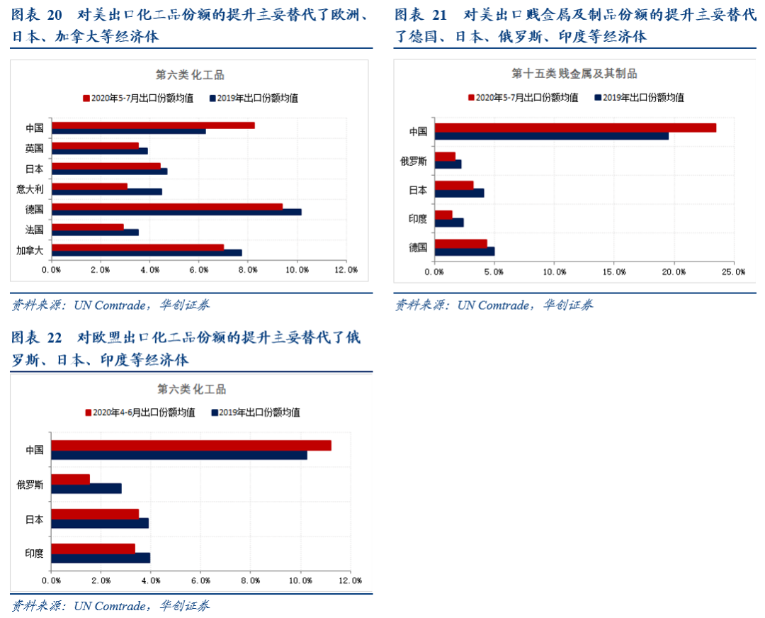 其次从疫情后海外各行业的情况来看:汽车制造业方面,疫情后我国汽车生产自4月起就显著修复,而日德汽车生产在4-6月呈现大幅下滑,供给端受疫情的临时冲击显著;化工品方面,全球大型化工品企业68%集中在欧美日,同样受疫情对供给的冲击显著。而这些行业恰好是中国比较优势并不突出的领域,因此近期呈现的出口替代最有可能是暂时性的。