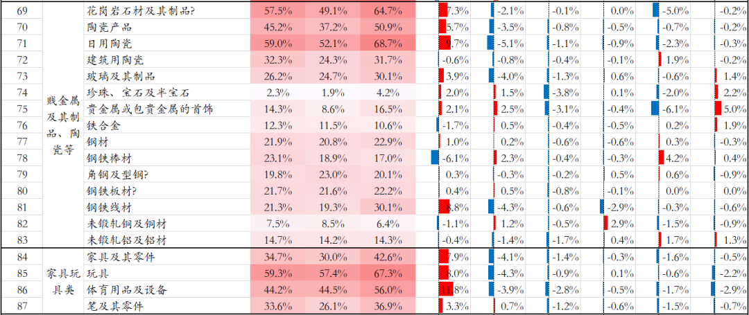我们用两个简单的标准来衡量一个商品今年提升的份额会不会回落。一个是今年商品份额提升的幅度。另一个是该商品的全球竞争力。如果一个商品全球竞争力非常高,同时今年份额提升幅度较大,我们倾向于认为这类商品是借助疫情提高了自己的全球市场份额。后续即便疫情消散,份额也可能不会回落。如果一个商品全球竞争力一般,今年份额提升幅度较大,我们倾向于认为这类商品是短暂的享受了海外供给受限带来的红利,后续随着疫情消散,海外供给恢复,这类商品的份额会出现明显的回落。我们评价一类商品全球竞争力的方法,是计算其RCA指数排名(30个出口金额超过1000以美元的国家或地区参与排名)。排名越靠前,竞争力越强。如果以RCA指数排名前五、今年份额提升幅度超过3%为界,满足这个标准的商品后续份额回落的概率较低。这类商品有:家电类(电扇、洗衣机、微波炉、电视机、数字照相机、无线电广播接收设备等);家具日用品类(家具、玩具、体育用品、笔、灯具及照明装置、日用陶瓷、玻璃及其制品、眼镜及其零件);电子元器件类(有机发光二极管显示屏、二极管及类似半导体器件、太阳能电池);车辆船舶类(内燃机摩托车、自行车、婴孩车及其零件、集装箱船、散货船、纯电动客车(10座及以上));电气类(电工器材、原电池、蓄电池);机械设备类(手用或机用工具、缝制机械及其零件);塑料纺织制品类(非防疫,有塑料制品、家用或装饰用木制品、服装及衣着附件) 等如果以RCA指数排名没有进前十,今年份额提升幅度超过3%为界,满足这个标准的商品后续份额回落的概率较高。这类商品有:电动汽车类(纯电动乘用车、插电式混合动力乘用车);光学医疗仪器类(计量检测分析自控仪器及器具、医疗仪器及器械);车辆船舶类(客车(十座及以上)、汽车零配件);电气类(电气控制装置、低压开关及控制装置);机械设备类(泵、分离设备、机床)等。![]()