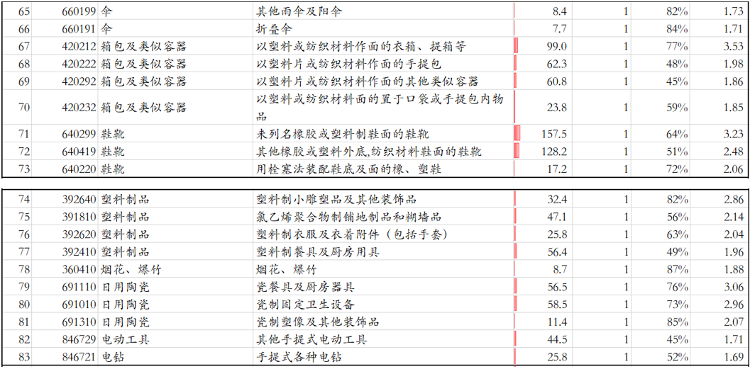 主要有如下几类商品:1)手机/电脑。2)一些电子产品。3)家电、家具。4)纺织织物、纺织制品、服装、鞋、箱包等。5)一些日用品,如塑料制品、烟花、日用陶瓷等。6)一些文化用品。如圣诞节用品、塑料制人造花等。