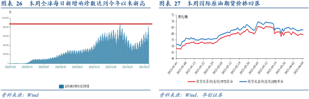 海外疫情再次反复,新冠变异病毒传染性强,过去一周全球每日新增确诊数达到今年以来新高,欧美等地防疫措施延长,再度引发对原油需求转弱的担忧,国际油价回落调整。截至4月9日,IPE布油期货结算价收于63.05美元/桶,下跌2.47%;WTI原油期货结算价收于59.32美元/桶,下跌3.47%。