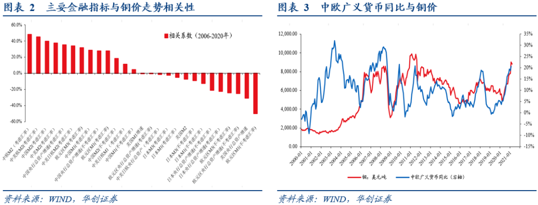 我们发现与铜价走势较为同步的是中欧两个经济体广义货币同比增速(考虑汇率波动,2006-2020年相关系数在0.48)。美国的M2与铜走势相关度较低(2006-2020年相关系数在-0.07)。加入美国的M2数据后,中美欧广义同比与铜价走势相关系数略有下降。