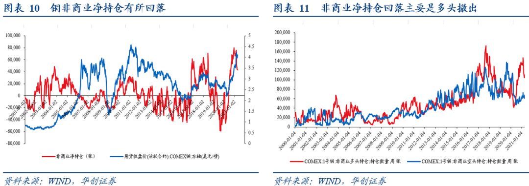通过总持仓衡量市场投资热情和信心——当持仓量持续增加时,行情单边延续性往往较强。COMEX铜总持仓自2020年3月跌至3年新低开始持续走高,铜价也在结束了2018年以来的下降趋势后转为趋势性上涨。近期(2月下旬以来)COMEX铜总持仓有所回落,显示本轮铜价上涨行情暂入分歧期。