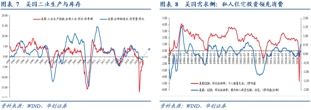 美国工业生产的上行,要么来自补库,要么来自需求。对于美国工业生产而言,这两种上行力量都具备。库存方面。美国制造业库存截止至今年1月,同比依然为负。我们预计这一轮补库的力度,大于2016-2017年,但弱于2009-2010年。需求侧,当下是美国地产的“好时候”,我们预计今年美国房地产周期将继续向上。参见报告《【华创宏观】美国地产的“好时候”——基于买、建、库、融四视角》。且历史经验看,美国地产周期向上,会带动经济向上,尤其是消费,美国私人住宅投资领先消费2个季度左右,意味着美国消费今年仍会偏强。