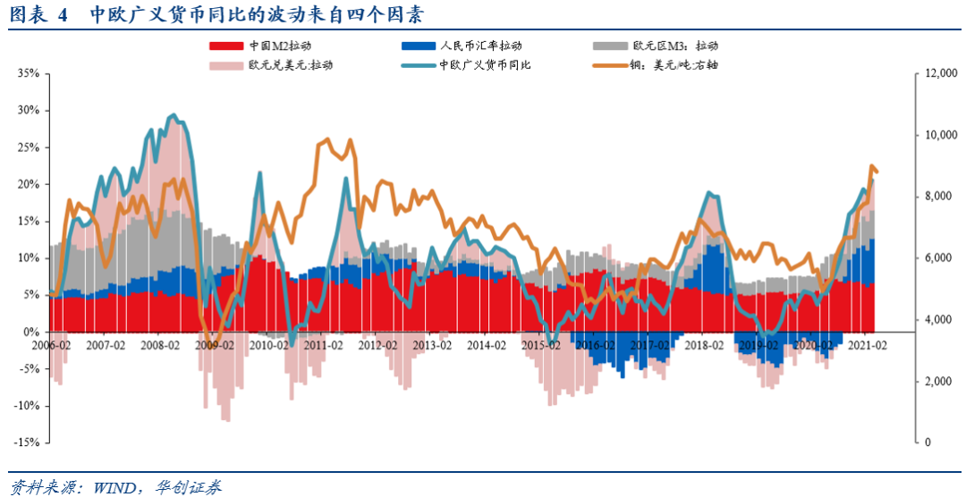 我们发现与铜价走势较为同步的是中欧两个经济体广义货币同比增速(考虑汇率波动,2006-2020年相关系数在0.48)。美国的M2与铜走势相关度较低(2006-2020年相关系数在-0.07)。加入美国的M2数据后,中美欧广义同比与铜价走势相关系数略有下降。但这并不意味着美国的货币供应对铜价无影响。如果不考虑中、日、欧的汇率(相对于美元)波动,中美日欧广义货币的任一组合,与铜相关系数最高的仅0.18(中国M2同比)。这意味着,尽管我们发现与铜相关系数最好的是中欧广义货币同比(折算成美元,考虑汇率波动)。但其背后,是来自两个力量的贡献。一是中国与欧洲自身的的广义货币扩张速度。二是人民币与欧元的汇率变动。