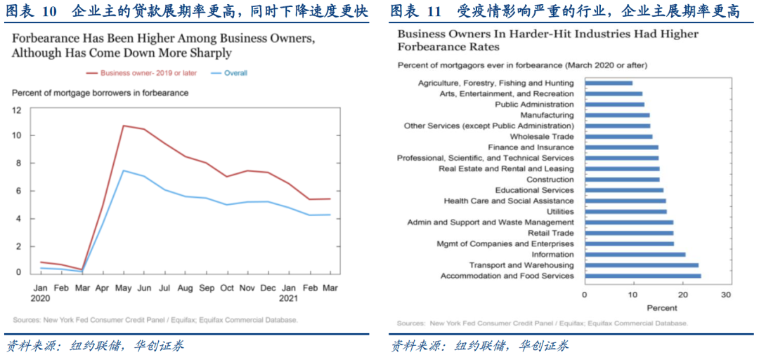 小企业主的贷款展期率比一般借款人更高。小企业主通常年龄较大、信用评分较高、信贷类型更丰富、平均抵押贷款账户余额也更高。因此小企业主的抵押贷款展期率比借款人整体的抵押贷款展期率高得多,2020年5月份达到11%(整体水平为10%),截至2021年3月下降为5%左右(整体水平为4.2%)。