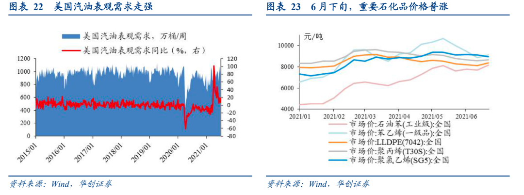 国内方面,汽油和柴油价格下跌。截至7月9日,汽油价格收于8207元/吨,下跌0.62%;柴油价格收于6642元/吨,下跌0.7%。6月下旬,重要石化品价格普涨。石油苯、苯乙烯、LLDPE、聚丙烯价格由跌转涨,分别上涨6.3%、2.6%、3.1%、0.8%;聚氯乙烯价格延续中旬跌势,下跌1.9%;顺丁橡胶、涤纶长丝价格延续涨势,分别上涨2.8%、2.4%。