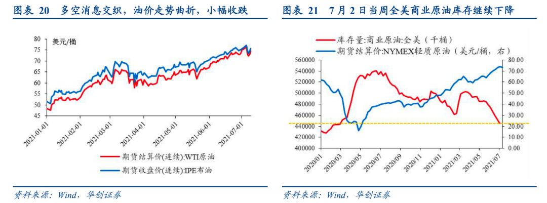 本周值得关注的消息有四点:1)OPEC+谈判破裂,增产协议未果。本周一,因沙特和阿联酋之间的巨大分歧,OPEC+未就增产协议达成一致意见,并取消了召开会议的计划。由于未达不成新的减产协议,OPEC+在8月不会增产,油价应声大涨。2)OPEC+内部分歧可能削弱减产约束,带来供给大幅增加的隐忧。本周二,阿联酋表示将增加石油产量来补贴可持续能源,计划在需求旺盛的情况下提高石油产量和市场份额,市场开始担忧减产约束削弱带来供给大幅增加,油价承压下跌。3)拜登政府“窗口指导”,希望OPEC+达成增产协议。白宫发言人周一表示美国正密切关注OPEC+谈判,政府官员已经和相关国家的政府进行了接触,敦促该组织达成妥协方案,使石油增产计划继续推进。4)美国商业原油库存继续大幅下降,已降至2020年2月份的水平。7月2日当周,美国商业原油库存下降686.6万桶,环比下降1.52%。