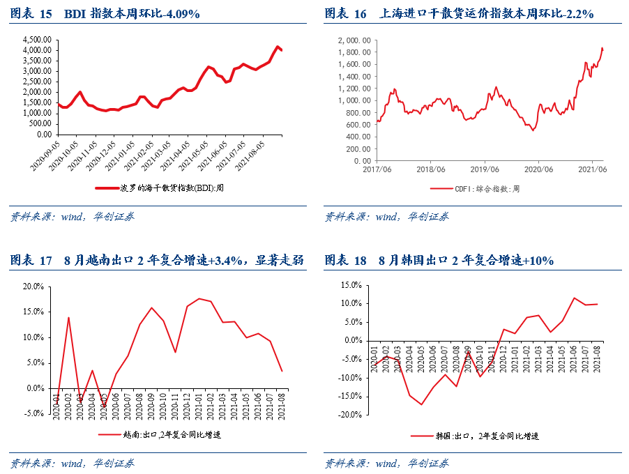 8月韩国、越南出口增速环比均出现回落,分别-4%(前值+1%)/-3%(前值+2%),2年复合增速分别+10%/+3.4%(前值+9.7%/+9.3%),受疫情影响越南出口显著走弱。另外,印度8月出口2年复合同比+27.5%,主要受益于对工程产品、石油产品与珠宝首饰的需求。
