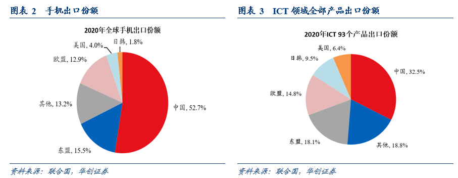进一步,统计含手机在内的全部电子产品,数据口径以联合国贸发组织定义的ICT产品目录为准,一共是93个商品(HS6位编码),包括半导体、集成电路等重要商品。2020年全球电子产品出口额是2.16万亿美元。中国的出口份额没有手机那么高,为32.5%。东盟份额为18.1%,日韩份额为9.5%。
