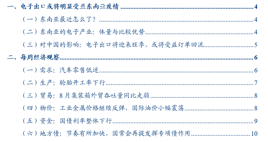 具体内容详见华创证券研究所9月5日发布的报告《【华创宏观】电子出口或将受益东南亚疫情——每周经济观察第35期》。