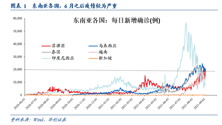 依然较为严重。9月3日,东南亚主要的六个国家新增确诊人数合计为7.7万人,其中菲律宾、马来西亚单日新增确诊2万人左右(注:马来西亚政府希望在单日确诊降至4000人左右时重启生产活动),泰国、越南单日新增确诊在1.5万人左右。疫情影响下,东南亚的电子产业受冲击较大。比如马来西亚,根据证券时报的报道,“近期已有部分国际汽车厂商或零部件供应商宣布生产线大规模停产或减产。”