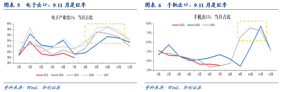 今年如果单纯看同比,9-10月出口增速会非常高。既有基数影响,也有东南亚疫情影响。如果以2019年的基数作为参考,7%的权重,意味着手机出口增速提高20个百分点,可以拉动出口1.4%。如果再考虑手机之外的其他电子产品,则短期对出口的支撑会更加明显。