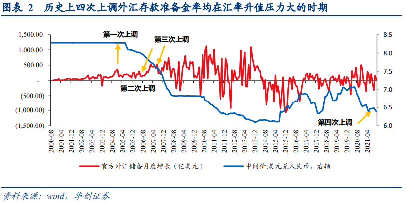 从提升准备金率的影响路径可以看到,上调外汇存款准备金可达到抑制人民币升值压力的作用,而历史上央行三次上调外汇存款准备金率也均在汇率升值压力加大的时期,起到了对汇率升值压力的抑制作用。