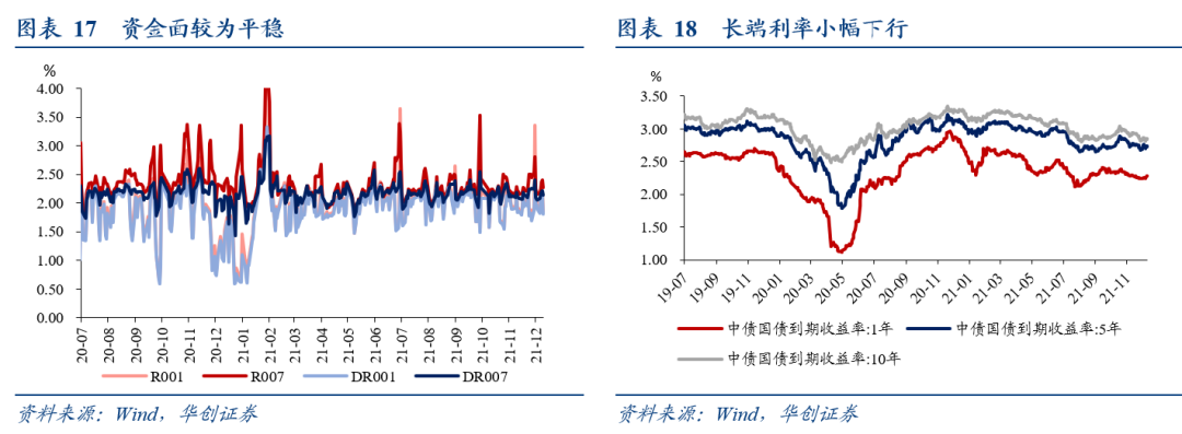截至12月10日,DR007收于2.1411%,DR001收于1.8031%,较上周环比分别变化+9.41bps、-9.62bps。本周央行净回笼1800亿,下周到期量约为10000亿。本周DR007连续四天上行,周五有所回调。整体来看,降准之后,当前资金面较为平稳,值得注意的是,本月15日MLF的实际操作量需密切关注,这或反映了当前央行货币政策的宽松力度。