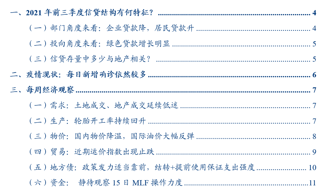 整个2021前三季度观测来看,企业贷款较去年同期减少了0.1万亿,居民贷款较去年同期增长0.23万亿,整个信贷结构体现居民杠杆微加,企业杠杆微降的特性。