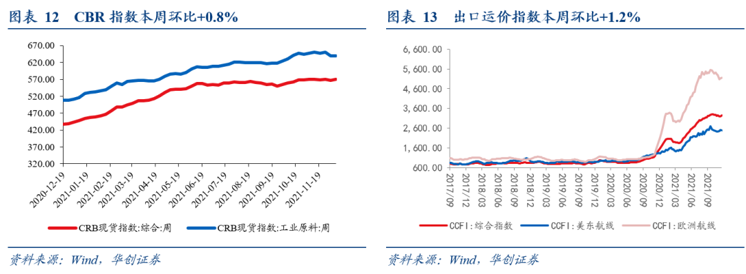 BDI指数本周环比+9.2%,连续第3周回升;CRB现货指数与工业原料指数本周环比+0.8%、-0.1%;中国进口干散货运价指数本周环比+3.4%,出口运价指数本周环比+1.2%,其中美东航线与欧洲航线运价指数分别环比-1%、+0.8%。