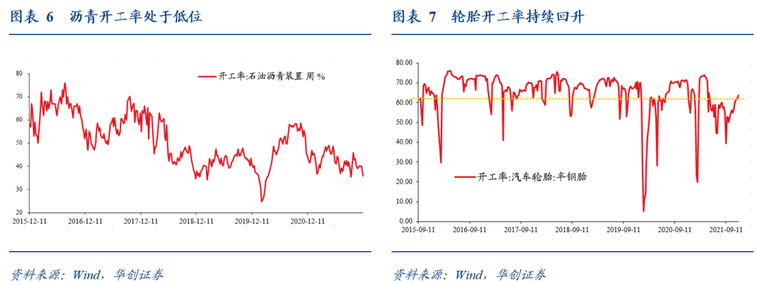 开工率方面,值得关注的是两个。一是沥青开工率持续低迷。近两周,沥青开工率都是低于40%。二是汽车轮胎开工率持续回升, 12月9日当周,汽车半钢胎开工率为63.77%。连续五周开工率处于60%以上,此前,5月-10月,开工率基本都在60%以下。