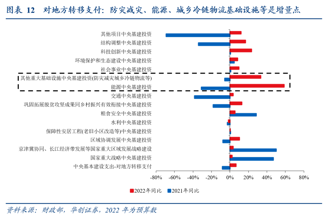 对地方转移支付4950亿,较去年执行数增加305亿,即今年中央预算内投资的300亿增量全部给地方。分项来看,除水利中央基建投资小幅负增外(-2%),普遍有所增长。其中能源(51亿)、其他重大基础设施(148亿)分别增长58%、33%,后者主要包括灾后重建和综合防灾减灾能力建设(111亿)及城乡冷链和国家物流枢纽建设(13亿)。