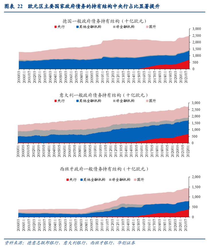 不过值得乐观的是,欧元区金融机构风险敞口收窄,银行业风险传染性减弱,金融系统较2011年欧债危机前稳定性更强。欧债危机后,中央银行持有各国政府债务的比重便有所提升,疫情后伴随央行扩大资产购买计划,欧元区主要国家政府债务的持有结构中央行占比再度显著提升,例如德、意、西政府一般债务中央行持有占比分别由疫情前2019年末的17.9%、16.8%、18.2%升至2021年末的28.9%、25.3%、27.9%,对应其他金融机构持有占比分别下降4.1、4.1、5.5个百分点,表明金融机构的风险敞口仍在收窄,这也减小了债务违约导致的欧元区金融机构出现交叉风险的可能性。![]()